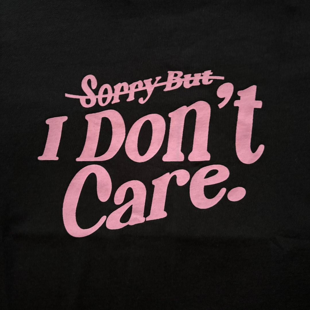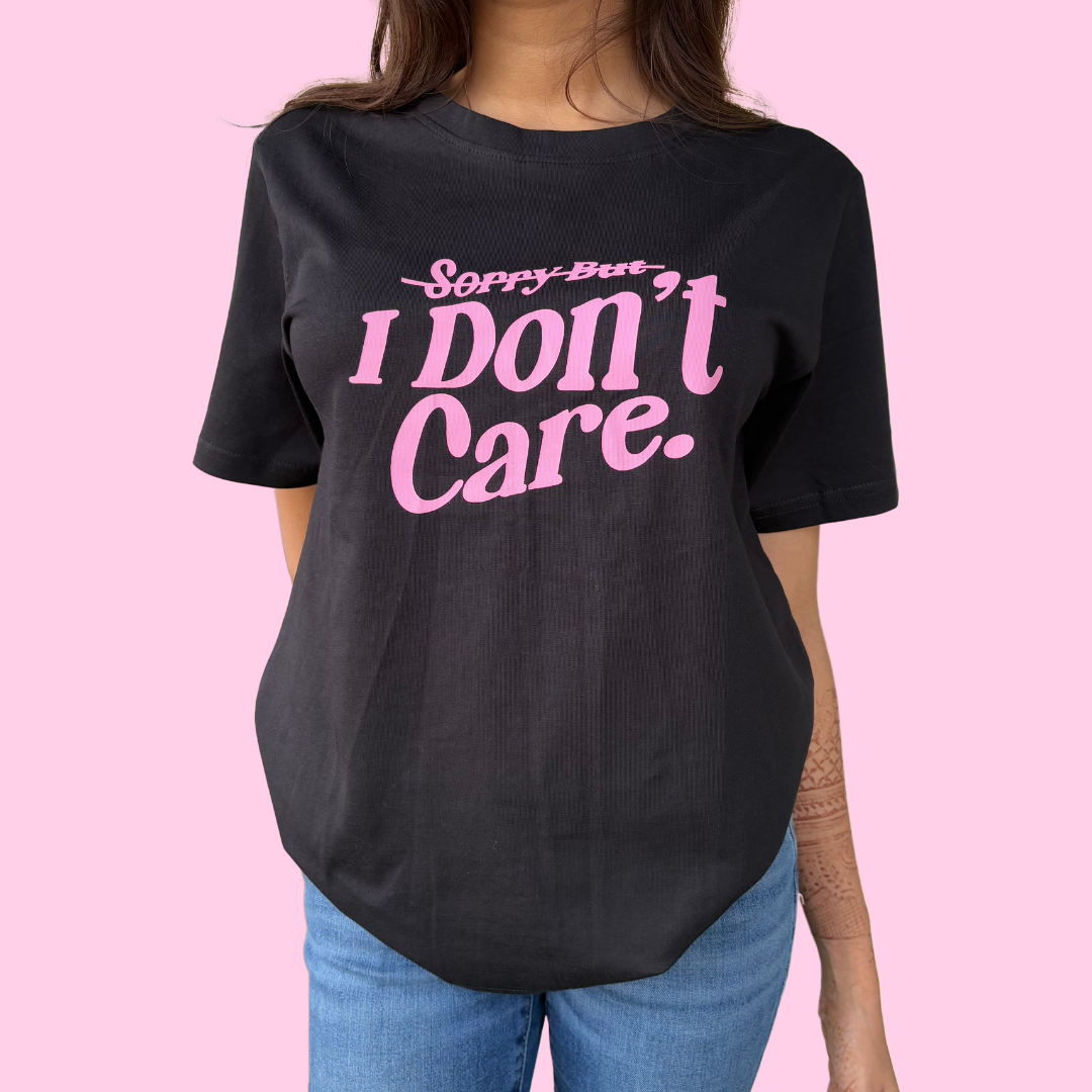 Make a bold statement with our oversized black tee featuring a playful pink "I Don’t Care" graphic. Made from soft, breathable cotton blend fabric, this t-shirt offers all-day comfort with a relaxed, street-style fit. Perfect for effortless styling—pair it with jeans, shorts, or layer it up.