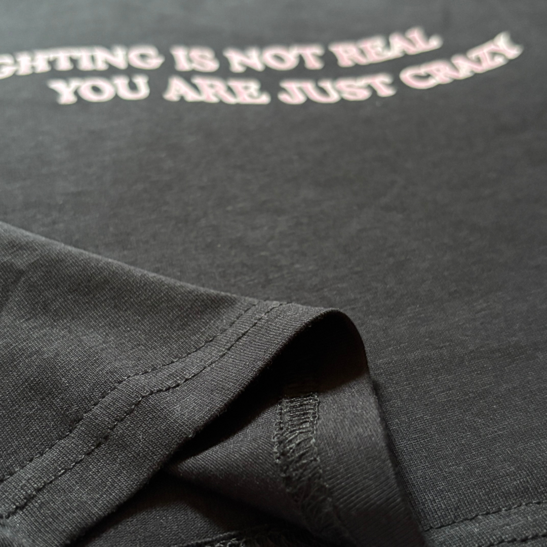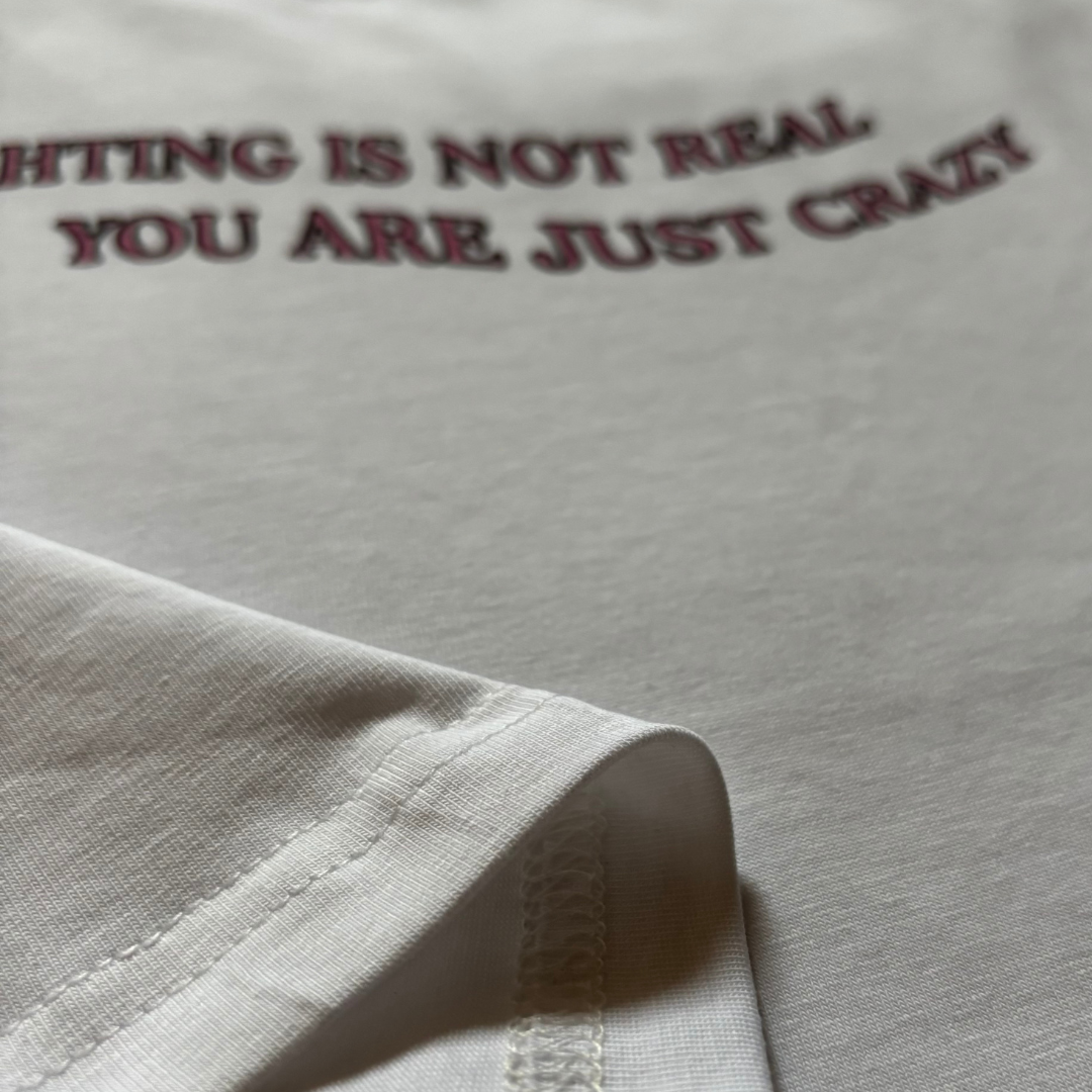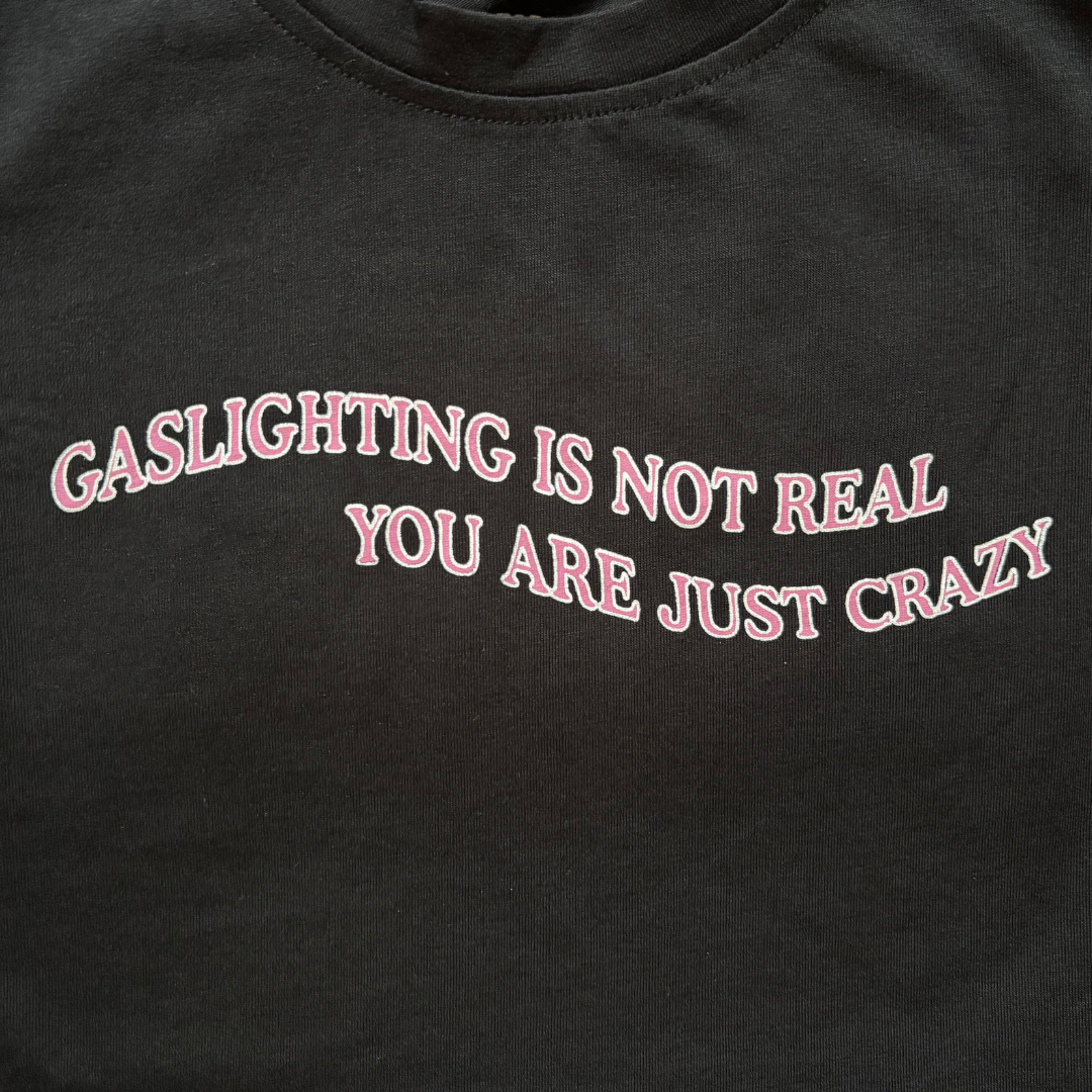 Make a bold statement with this edgy crop top featuring the cheeky slogan, "Gaslighting Is Not Real, You Are Just Crazy," in soft pink lettering. Designed with premium stretch fabric, it offers a comfortable, body-hugging fit. Perfect for those who wear their sass with confidence—pair it with denim for a casual, standout look!